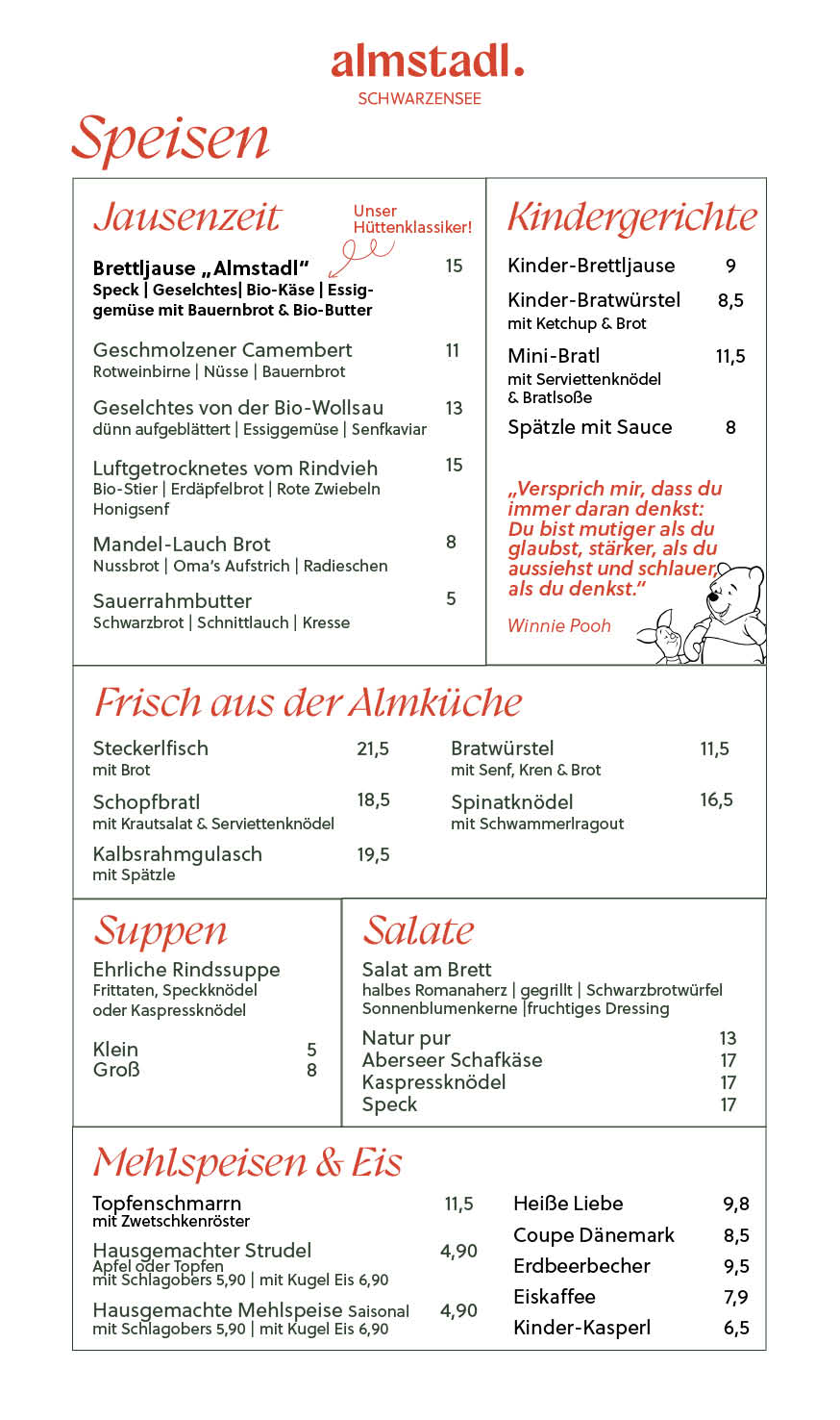 Wirf einen Blick in unsere Speisekarte! Dort findest du eine herrliche Auswahl, wie Almstadl Jause oder pfiffig belegte Brote. Außerdem bieten wir täglich wechselnde warme Tagesgerichte.