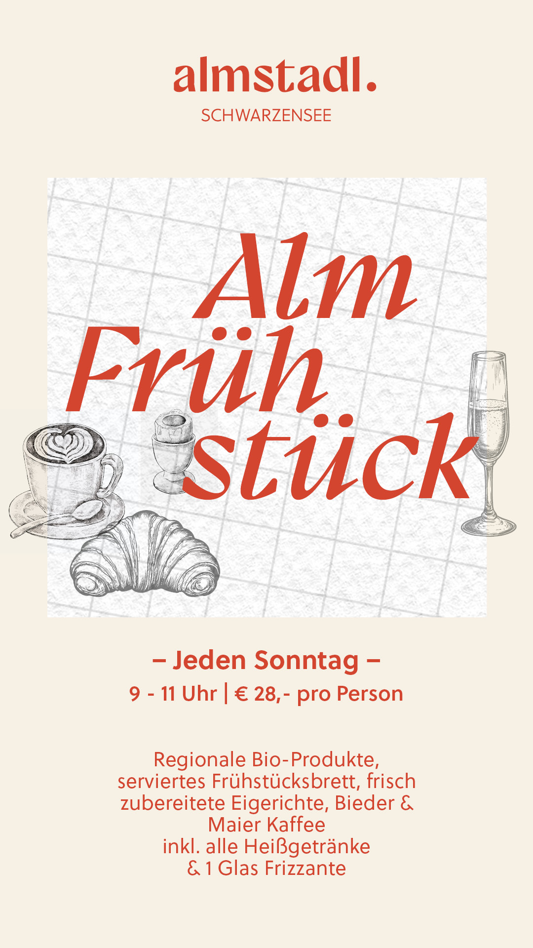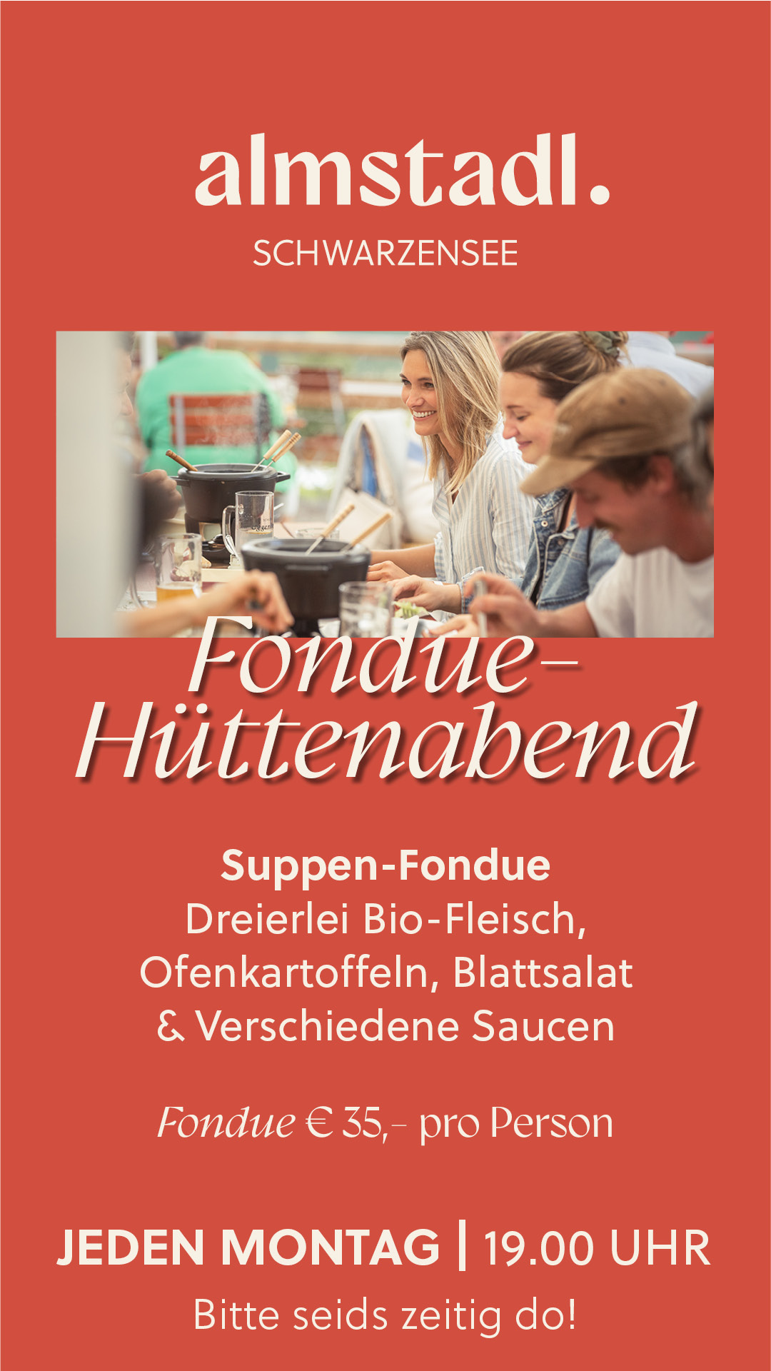 Wenn eines klar ist, dann, dass im Almstadl keine Langeweile aufkommt. Montags findet immer ein gemütlicher Fondueabend statt. Am Sonntag könnt ihr ein herrliches Alm-Frühstück genießen & anschließend zu traditioneller Musi schunkeln. Und was uns dann noch einfällt, das wissen wir jetzt auch noch nicht. – Seid gespannt!